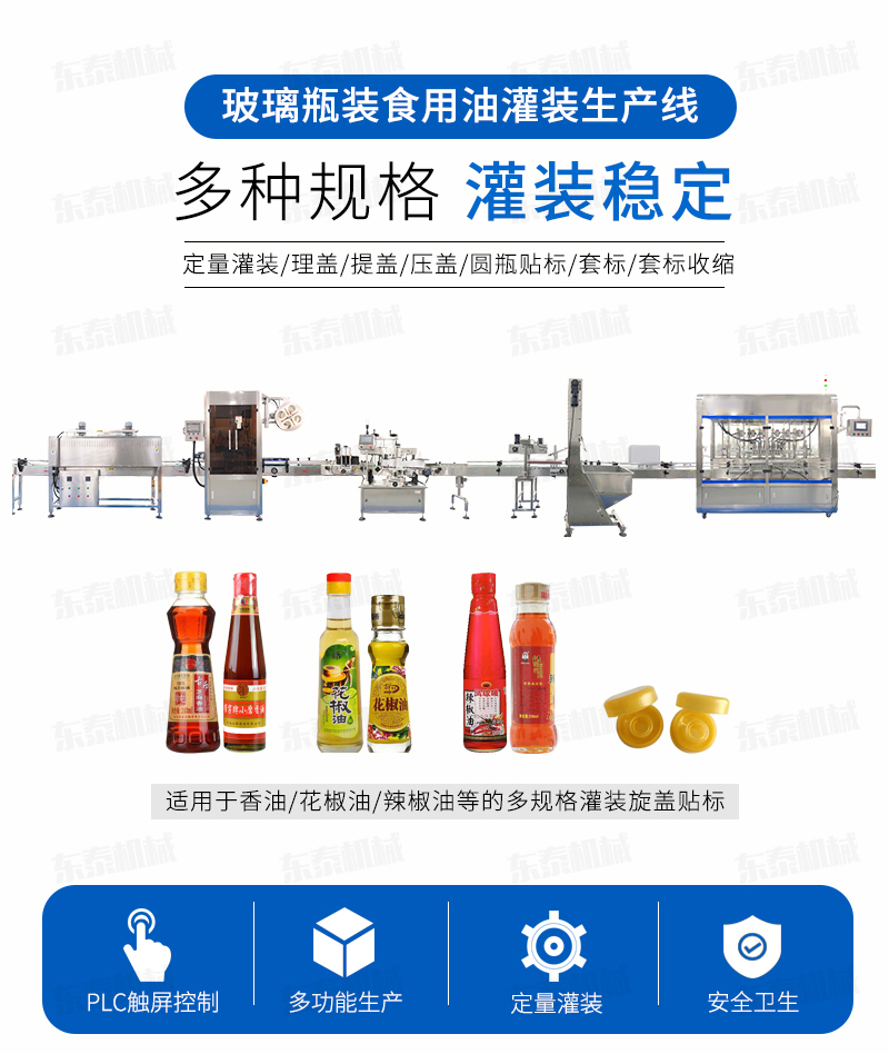 該系列灌裝機采用容積式計量灌裝原理,適用于各種規(100ml-1000ml)的南瓜籽油、榛子油、牡丹籽油、芝麻油、核桃油、山茶油、亞麻籽油、棉籽油、橄欖油、大豆油、玉米油、菜籽油等食用油灌裝。設備采用伺服驅動活塞計量,保證了 1‰的灌裝精度,在保證灌裝精度的同時,提高了 20%-35%灌裝速度,操作簡單,維護方便,節省人工成本,生產效率更高。