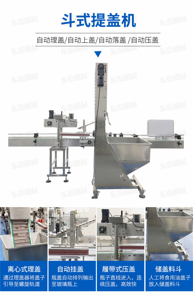 該提蓋式主要適用于制藥、食品、化工、日化等行業,是自動化生產線中旋蓋機、壓蓋機等的理想配套設備。采用底部添蓋替代傳統的手動上蓋,使自動化工作更加方便、快捷。特別是對于要求不能有磨損的瓶蓋如印刷好后的蓋子需要到下一步工序生產或者包裝等,此設備也可強有效的減少磨損;其工作原理是通過微動開關檢測的作用,通過輸送刮板,把料斗里的瓶蓋按生產需要勻速的送入理蓋器中,確保了理蓋器內的瓶蓋能保持在佳的狀態;