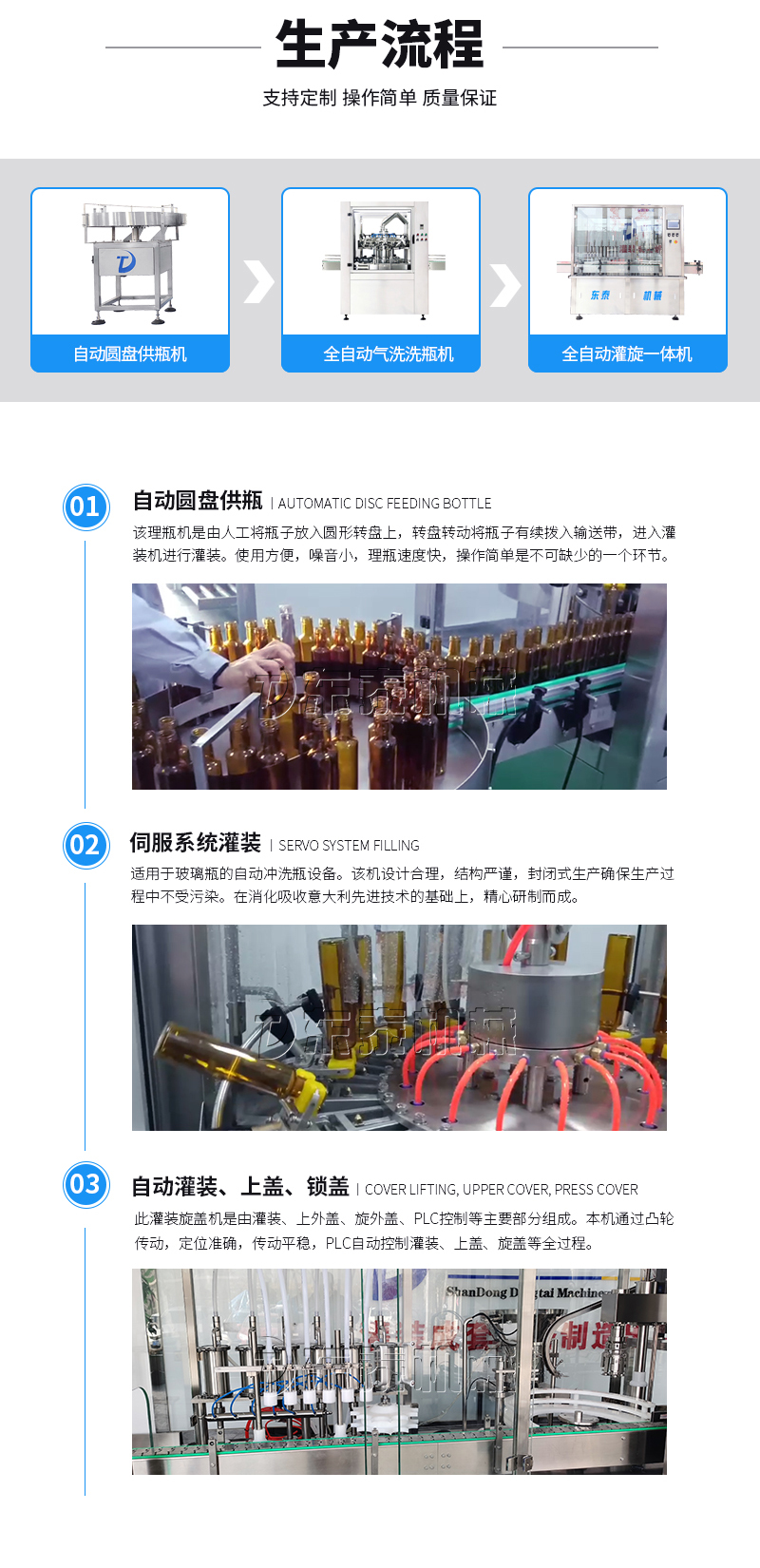 本灌裝流水線設(shè)備具有穩(wěn)定可靠、自動(dòng)化水平高,相比同類產(chǎn)品有著更長的使用年限,維護(hù)簡單,整線中各設(shè)備的協(xié)調(diào)性、連貫性強(qiáng),整線設(shè)計(jì)合理等特點(diǎn)。灌裝設(shè)備采用獨(dú)家專利系統(tǒng)結(jié)構(gòu),為當(dāng)今行業(yè)內(nèi)水平,整線滿足量產(chǎn)化、集成化生產(chǎn)的需要。