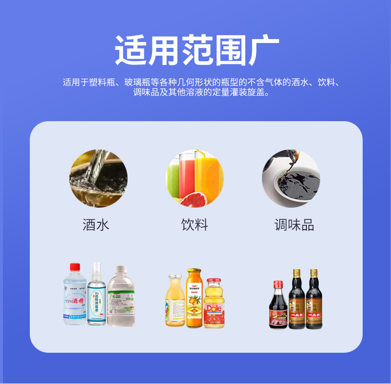 本機適用于多種材質,多種幾何形狀的容器,如塑料片、玻璃瓶、金屬瓶等;在需要更換瓶或蓋的時候,只要調整部分零件的位置即可,無需更換任何配件;在旋蓋過程中可以做到無瓶不下蓋。理蓋器、輸送機、旋蓋機、夾瓶皮帶速度可分別變頻調速,適應在規定范圍內的各類規格的旋蓋。(附:特殊規格定制即可)
