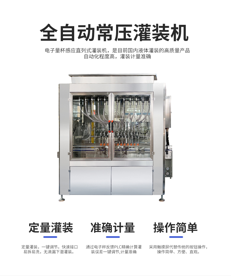 電子量杯感應直列式灌裝機,是目前國內液體灌裝的高端產品,自動化程度高,灌裝計量精確,適用于塑料瓶、玻璃瓶等各種幾何形狀的瓶型的不含氣體的酒水、飲料、調味品及其他溶液的定量灌裝。機器采用觸摸屏代替傳統的按鈕操作,操作簡單、方便、直觀?萍己扛。機器灌裝計量可通過觸摸屏對灌裝時間的調整實現不同計量灌裝,方便操作者使用。