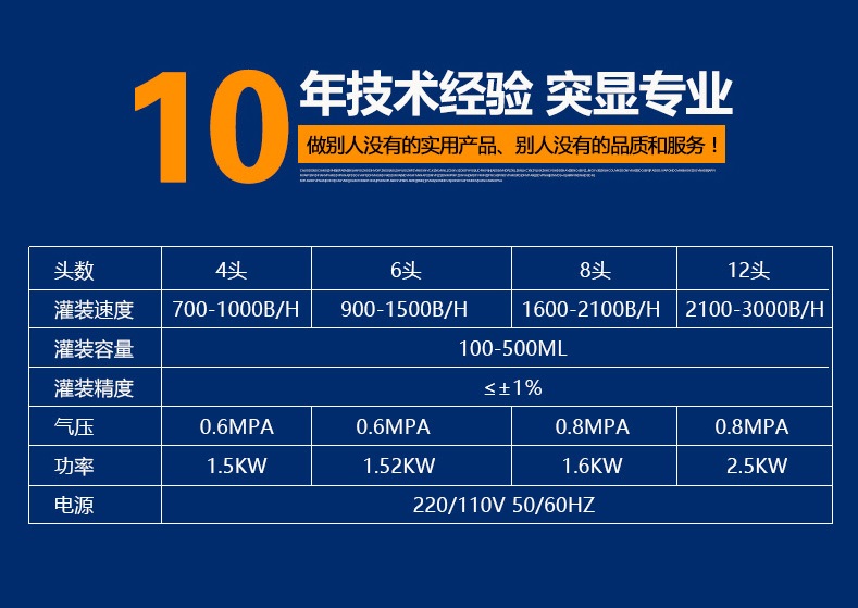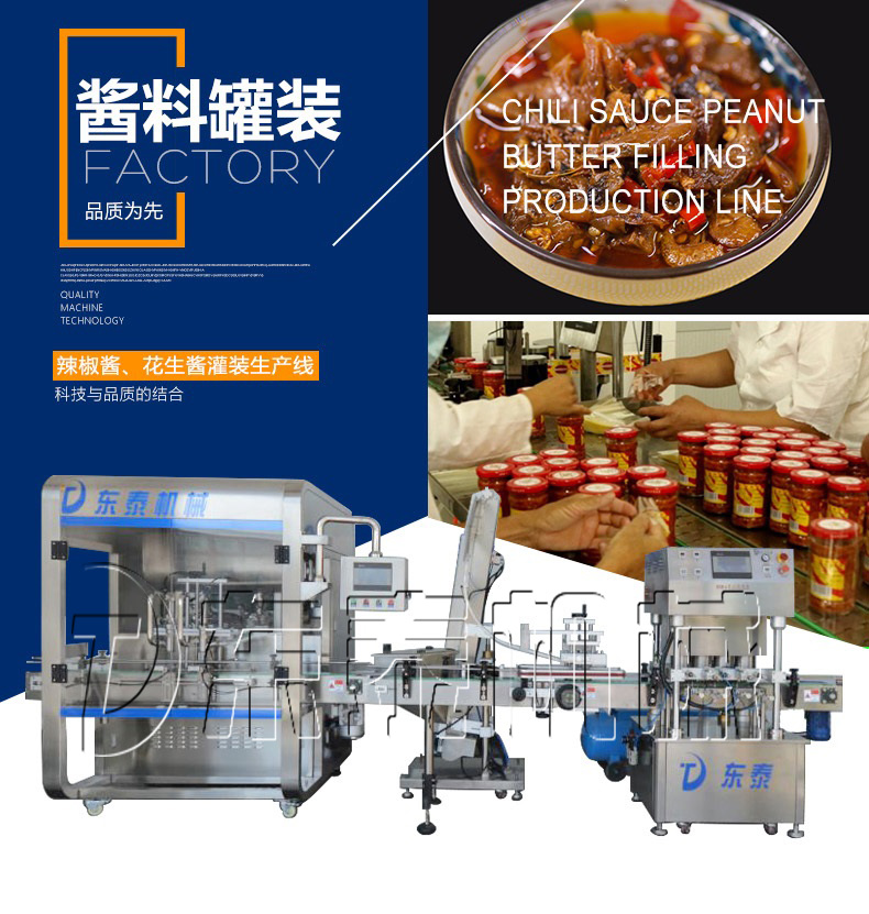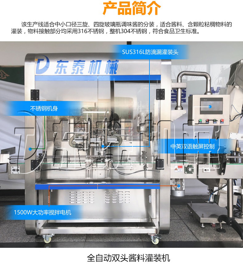 該生產(chǎn)線適合中小口徑三旋、四旋玻璃瓶調(diào)味醬的分裝,適合醬料、含顆粒黏稠物料的灌裝,物料接觸部分均采用316不銹鋼,整機(jī)304不銹鋼,符合食品衛(wèi)生標(biāo)準(zhǔn)。該機(jī)設(shè)計(jì)合理,機(jī)型小巧,立式結(jié)構(gòu),節(jié)省場(chǎng)地,操作方便。啟動(dòng)部分均采用德國FESTO和臺(tái)灣AirTack的氣動(dòng)元件。灌裝閥有氣動(dòng)閥控制,灌裝精度更高,灌裝量和灌裝速度均可任意調(diào)整,灌裝悶頭采用防拉絲及升降灌裝裝置。